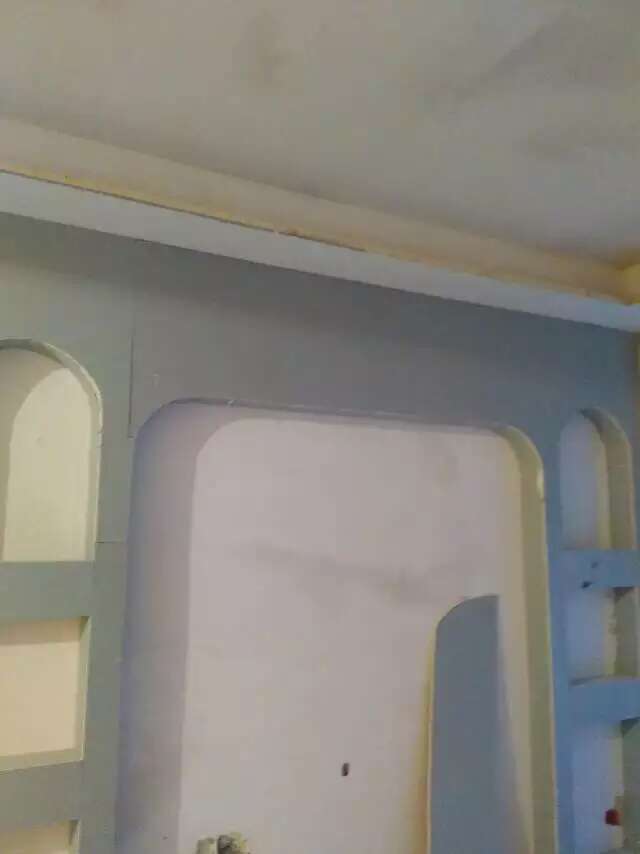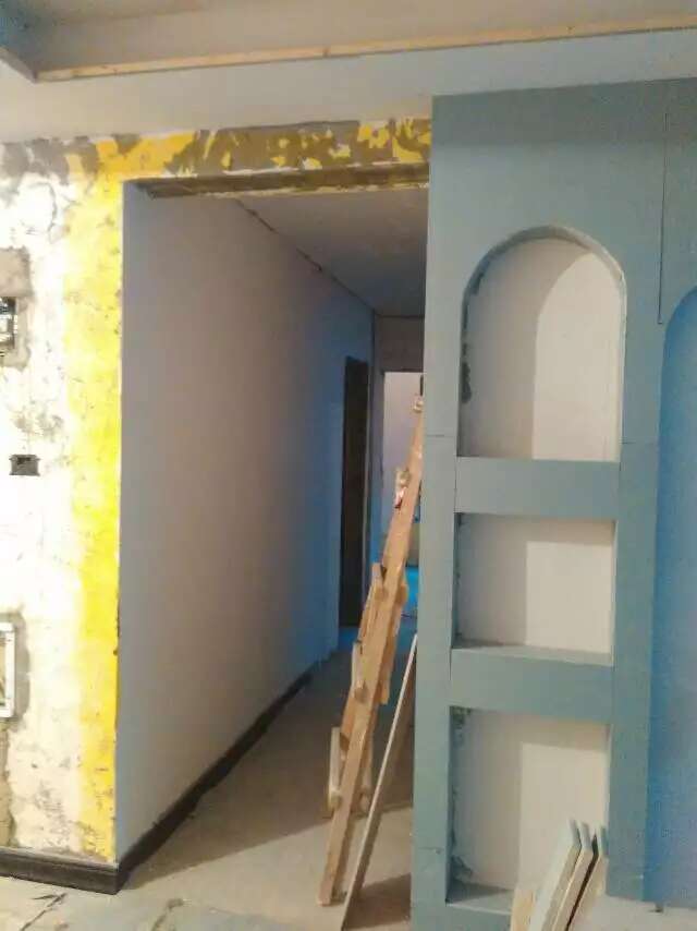 [前面的图是我们做的小曾家,木工罗师傅在做电视造型墙了,漆工罗师傅墙面刷了界面剂,第一道找平大部分了。后面两张是敬先生正在给别朋友刚施工的工地]