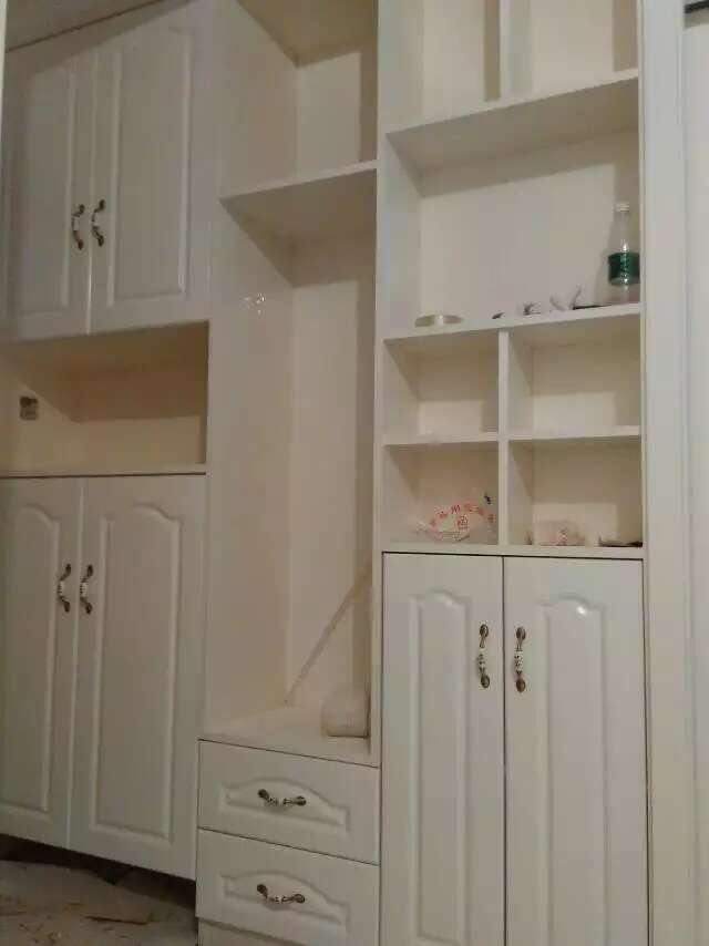 更多介绍我们木工师傅现场打制的综合柜门板安装后成型了,柜子是业主小曾自己设计的,左边是鞋柜,中间放上软垫就是换鞋凳,右边挨着厨房门位置本来以前是墙体,打了后也做柜子了,背面直接挂网、抹灰、防水、贴砖的。这个柜子可以放点小物件和酒水。