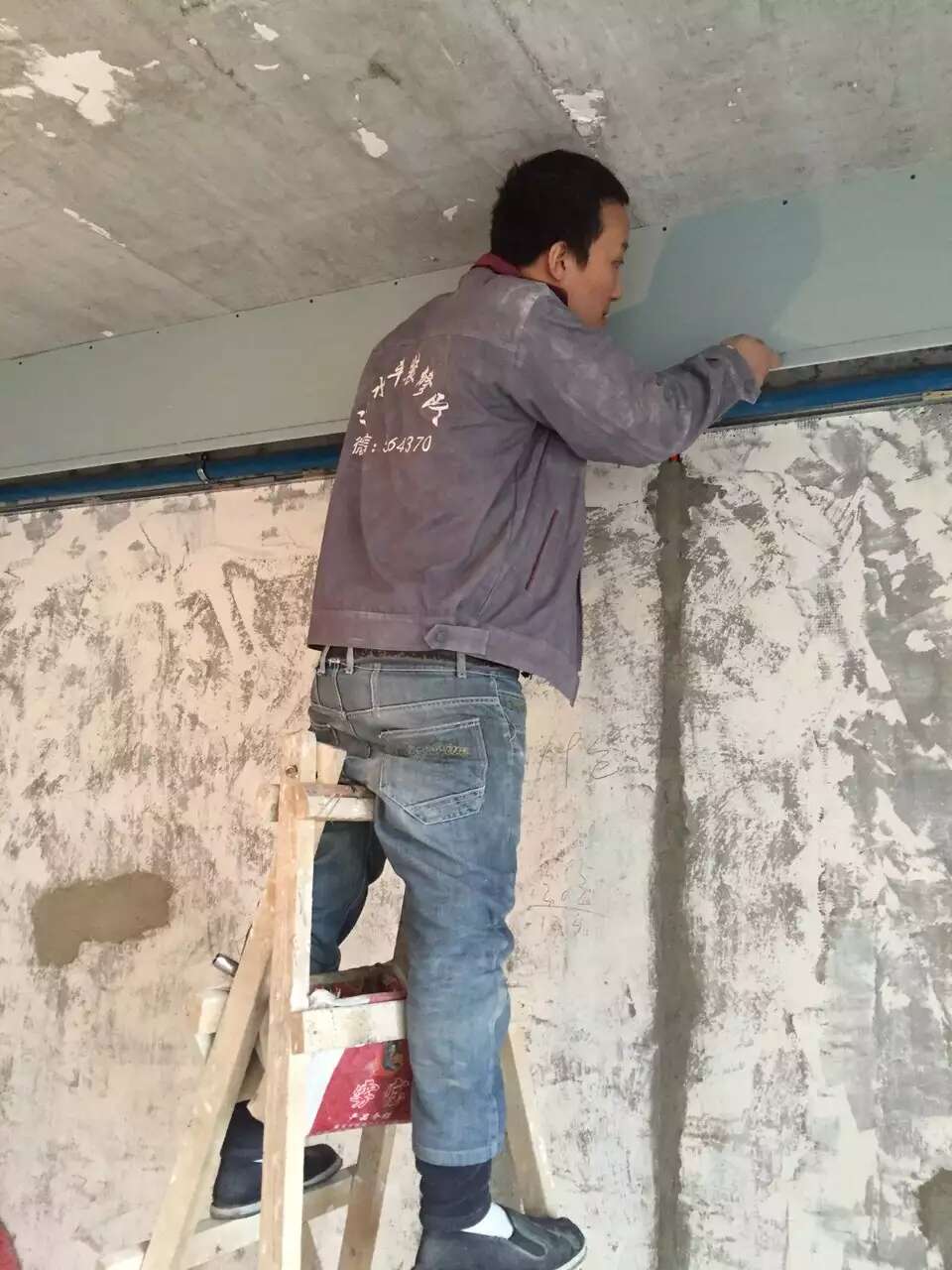 木工老张小张师傅父子正在施工吊顶。也以简约为主,主要遮蔽中央空调和新风管道为主,外加顶边的眉线,让墙面顶面分界一致,同一水平线,以后视觉看着统一整洁。