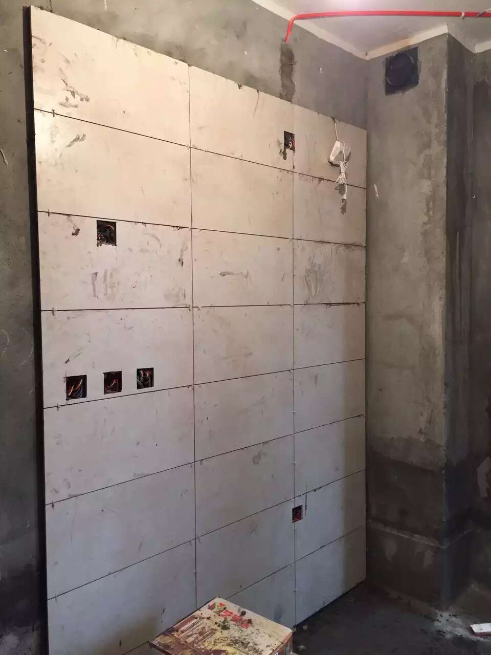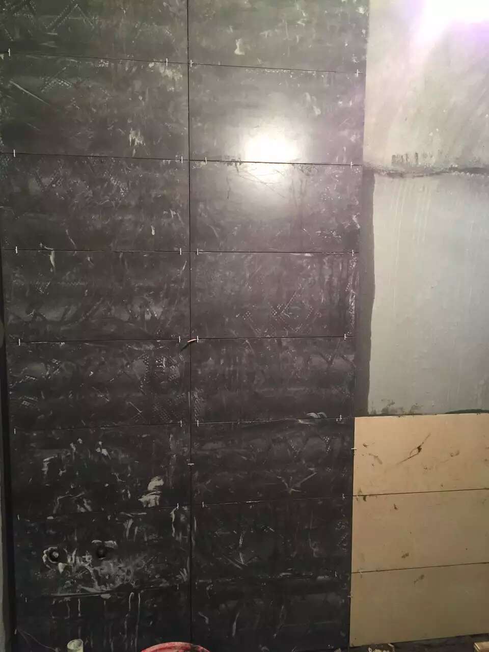 泥工蔡师傅也开始贴砖了,卫生间高冷的深灰仿古砖,淋浴隔断内按业主小邓要求分色,用温暖点的布纹砖。