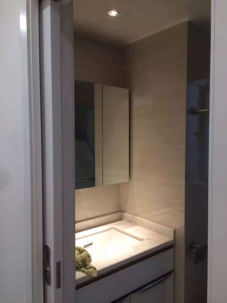 南城都汇的卫生间小,要精打细算才能合理布置,两个卫生间都是洗面盆靠门,而门左侧洗面盆,右侧淋雨隔断。中间位置窄,如果安装平开门将会非常碍事。推拉门是最合理的方式。
