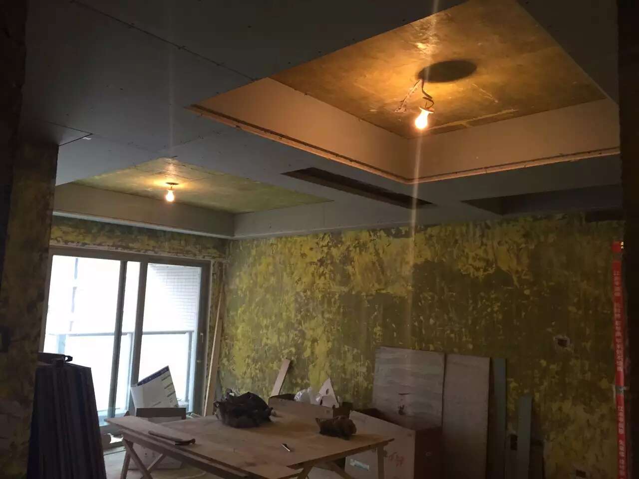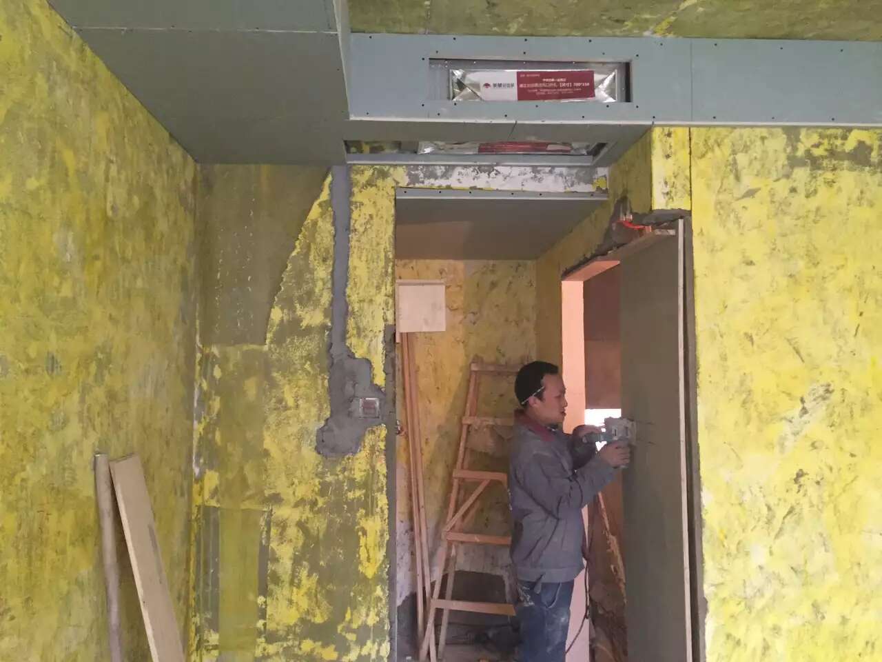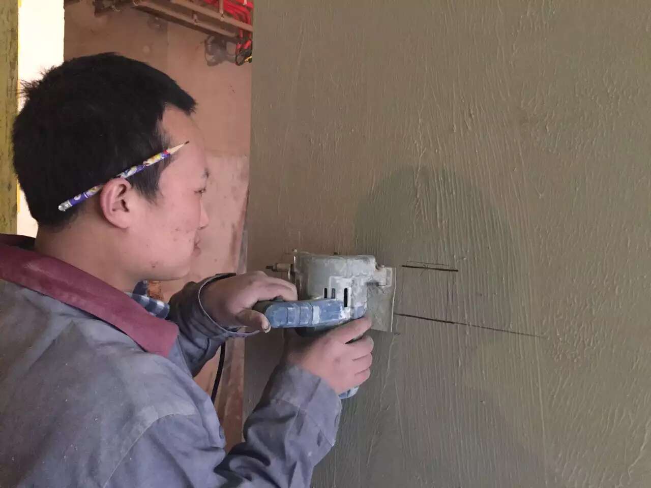更多介绍木工张师傅已完成吊顶,正施工主卫的暗藏滑门基层,切割开关插座底盒孔。