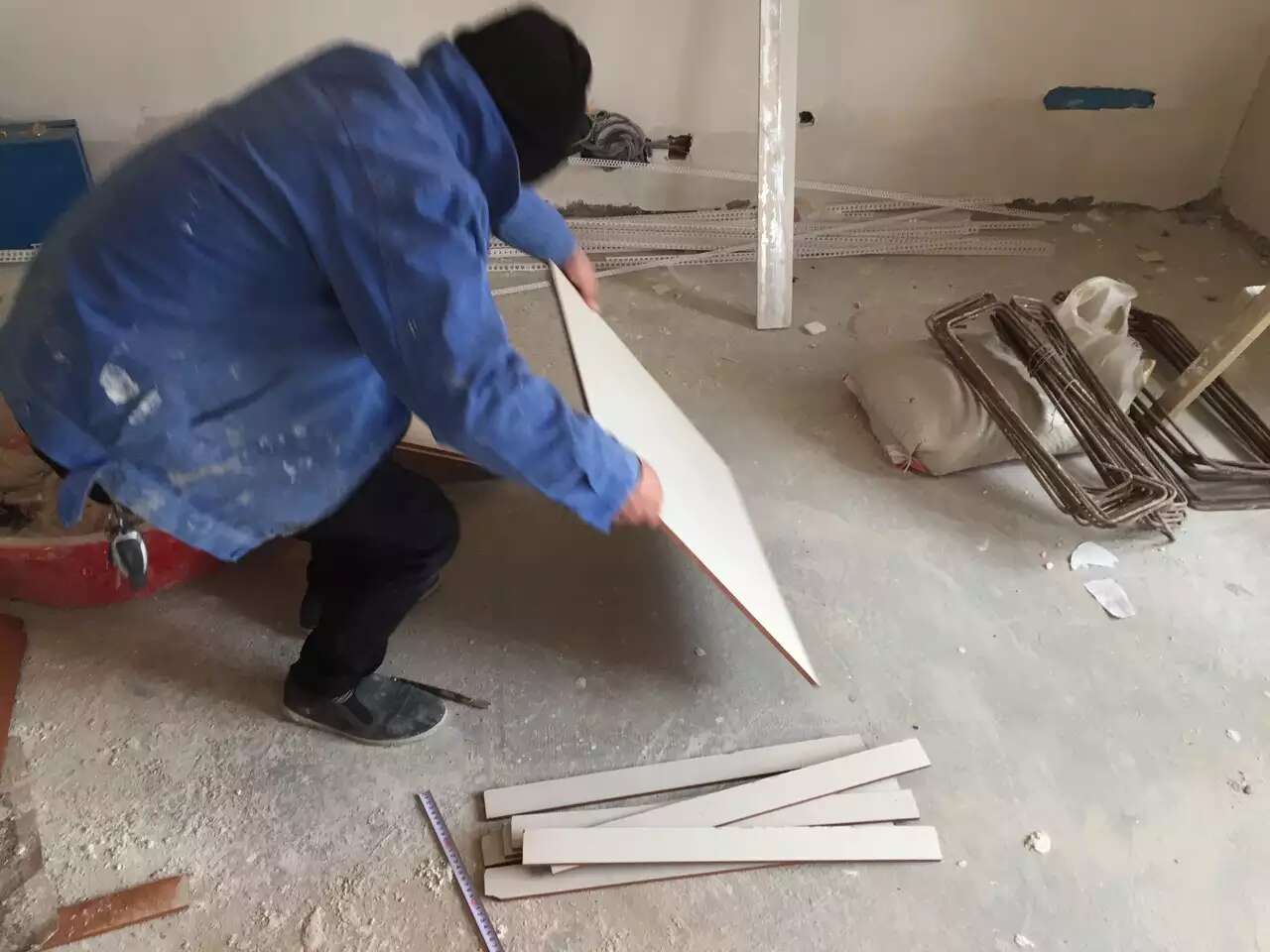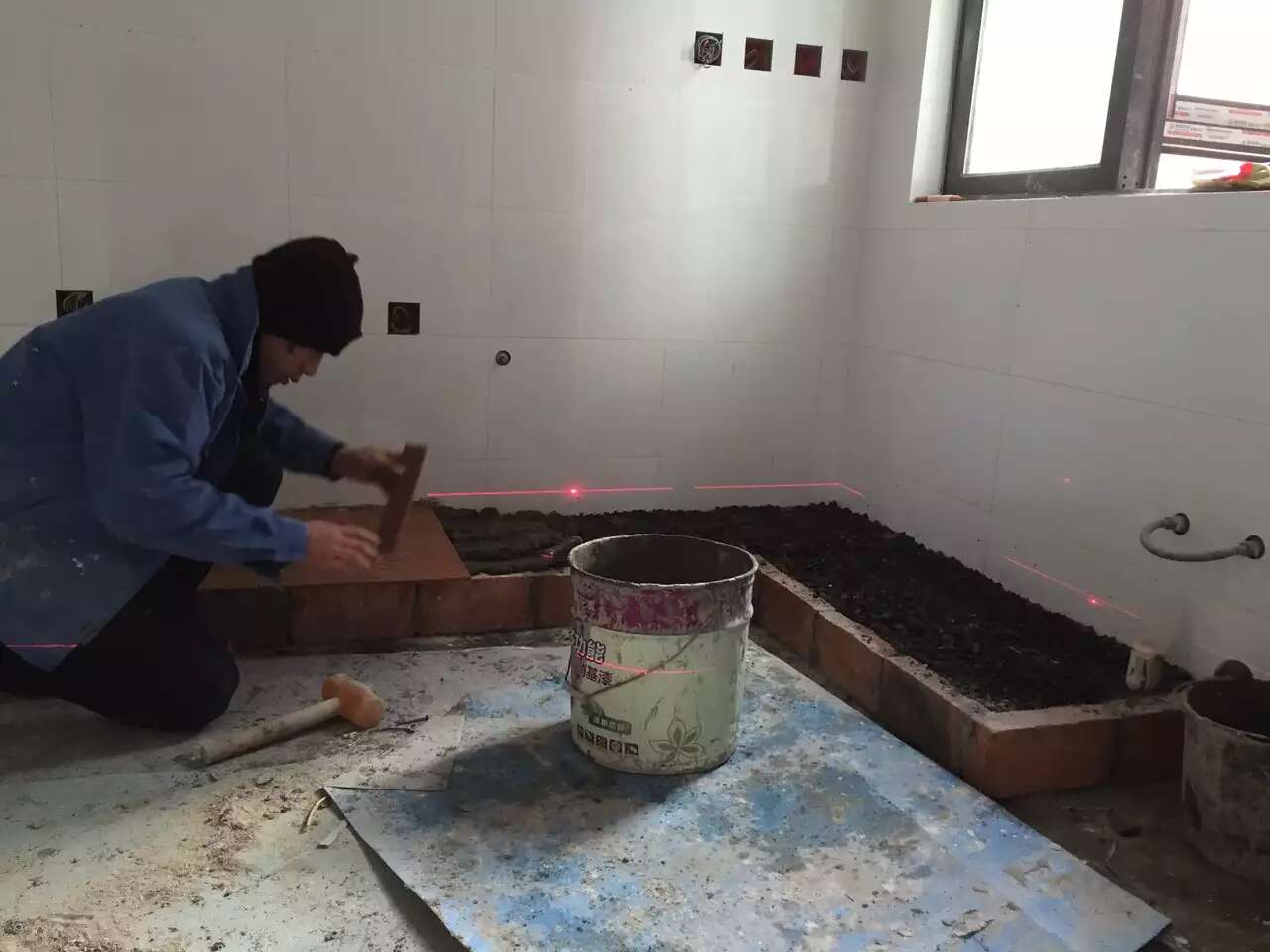 瓷砖橱柜邹师傅今天开始制作基层,瓷砖橱柜基层必须平整,才会美观,特别门板的美观和基层的尺寸相关很大,橱柜底板邹师傅用红外线校平。