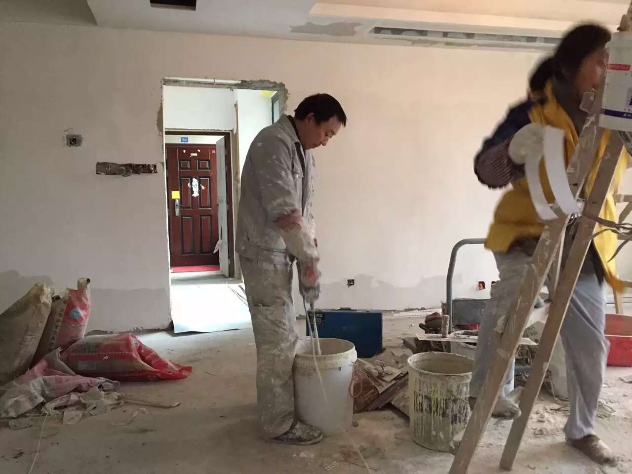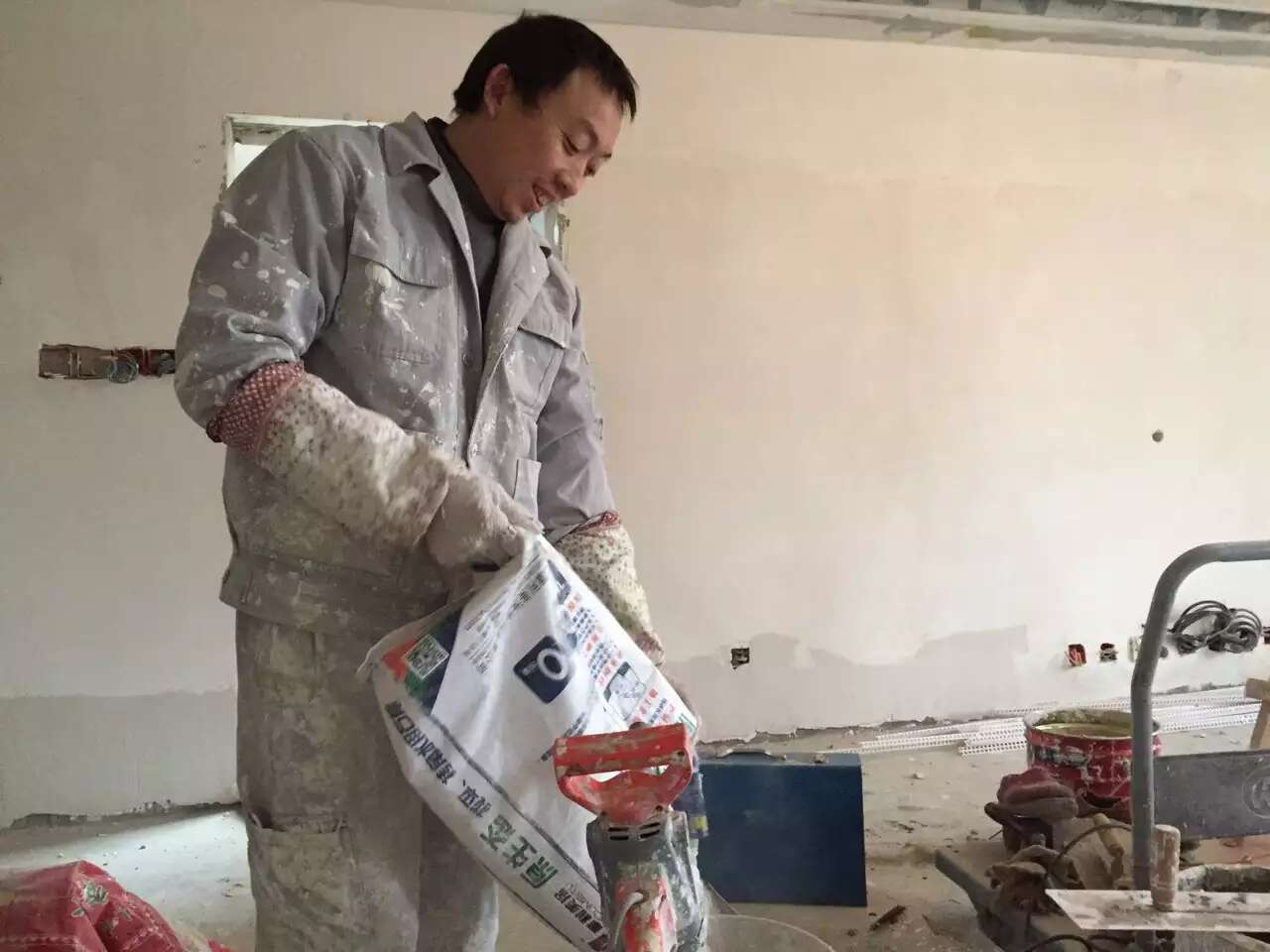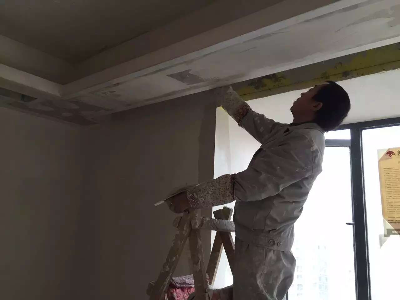 漆工罗师傅做墙面找平。一般铲墙后的建筑原墙顶面都是不平整的,罗师傅满刮石膏找平,可以让墙顶面尽量看上去平整美观。
