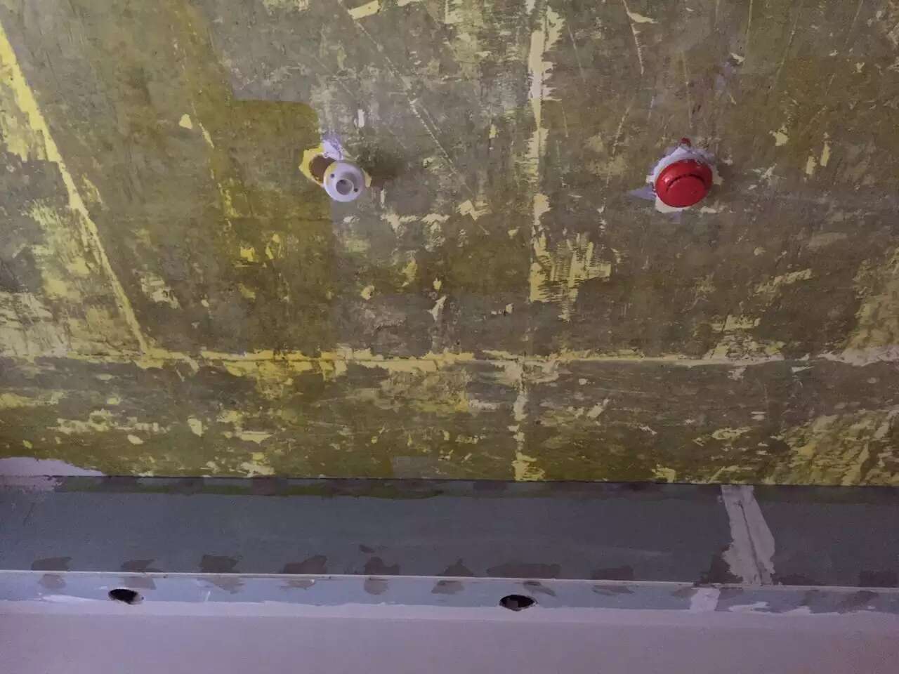 漆工李师傅对吊顶螺丝帽做了防锈处理,墙面找平一层完成。