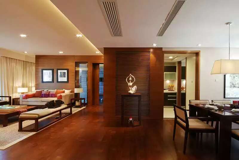 杨姐喜欢略深沉的居住空间,整体上是现代中式的意味。沙发墙和餐厅局部墙体为大面积的木板饰面。这种饰面通常都是木工板上贴饰面板做油漆。但那样环保性不好,造价也特高。我们建议用成品免漆板制作。免漆板是一个类别,表示板材上面已有覆膜饰面无需做漆,一般用于各种柜体,柜门制作。中纤板,颗粒板,实木拼接生态板,实木指接板,多层板都可以有相同饰面。虽然合适基材的免漆板可以满足环保,造价少的条件。但市面上的免漆板都很难达到可以做墙面装饰用途的纹路外观效果。杨姐这里是我们特地一同去选择的0甲醛的禾香板。可以同时满足做大墙面饰面的条件,只需要考虑合理用设计细节处理遮蔽固定于墙面的钉眼和接缝。