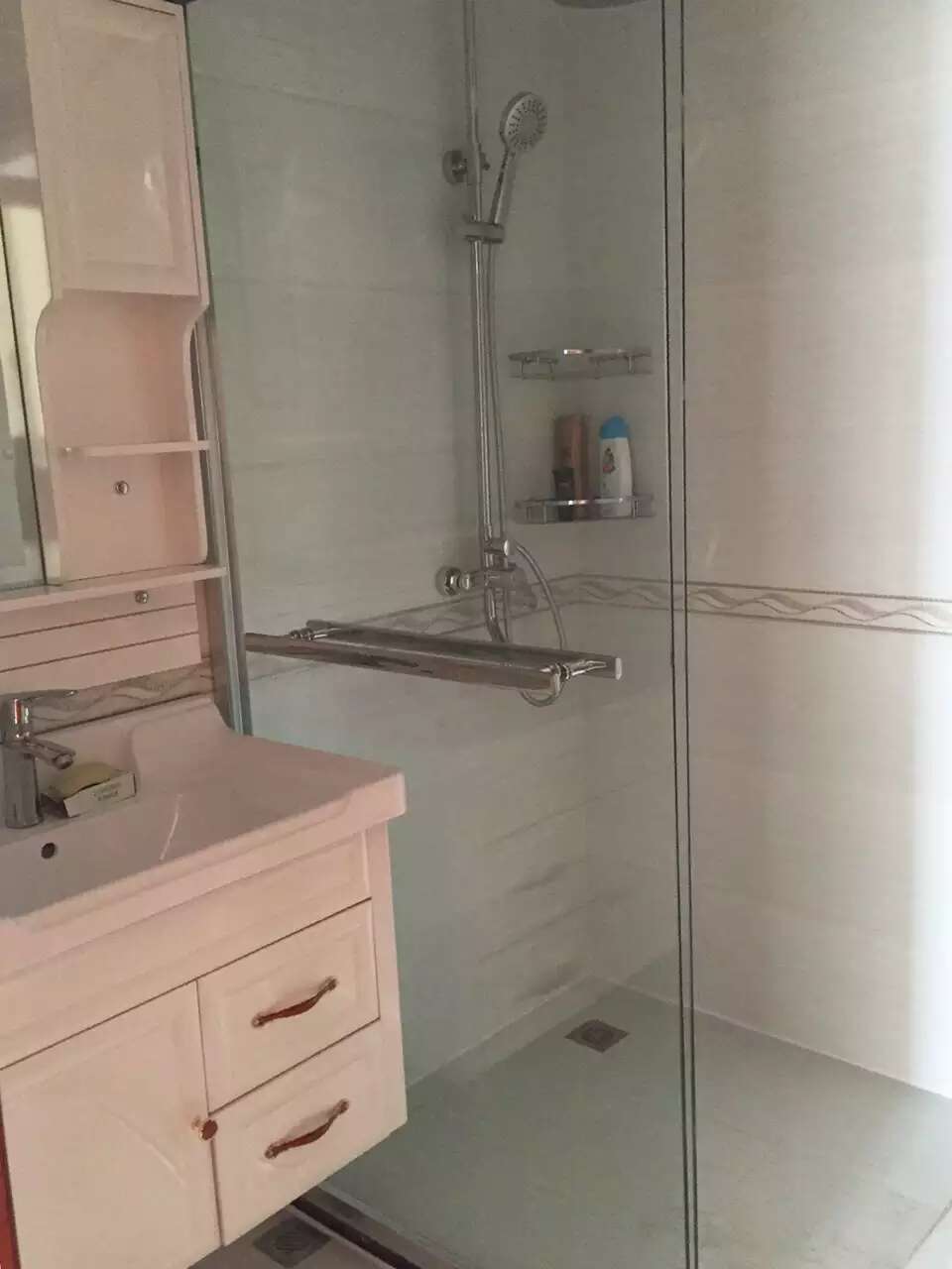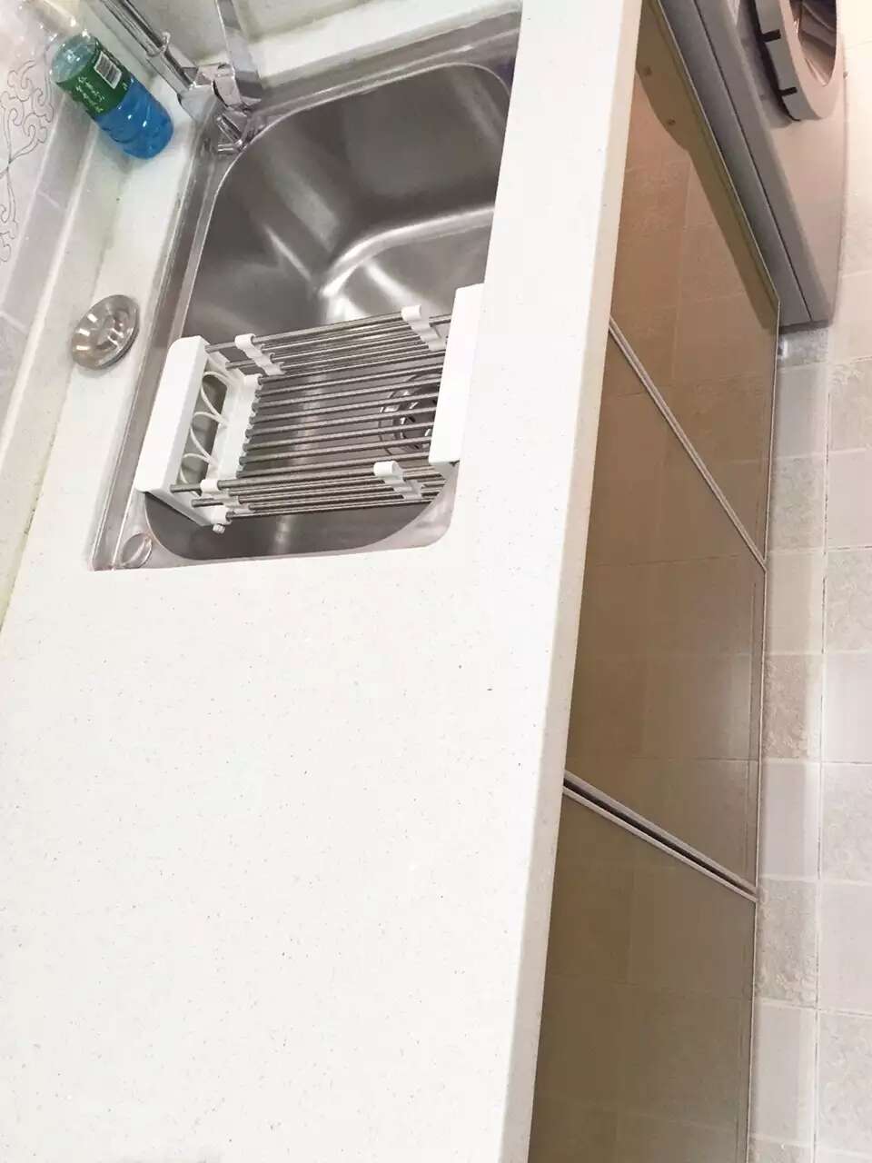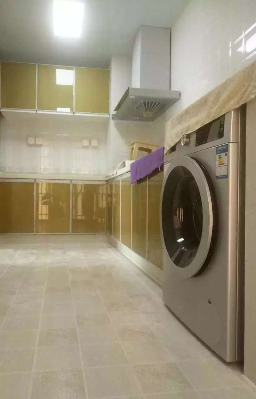 虽然简单,但细节还是要到位,业主不喜欢地板的扣条,我们就考虑过门石单面斜边,这要求地板不按常规顺光铺贴,而是横向靠着过门石。瓷砖橱柜台下盆更容易打理,做瓷砖橱柜时提前购买水槽,压台面下。