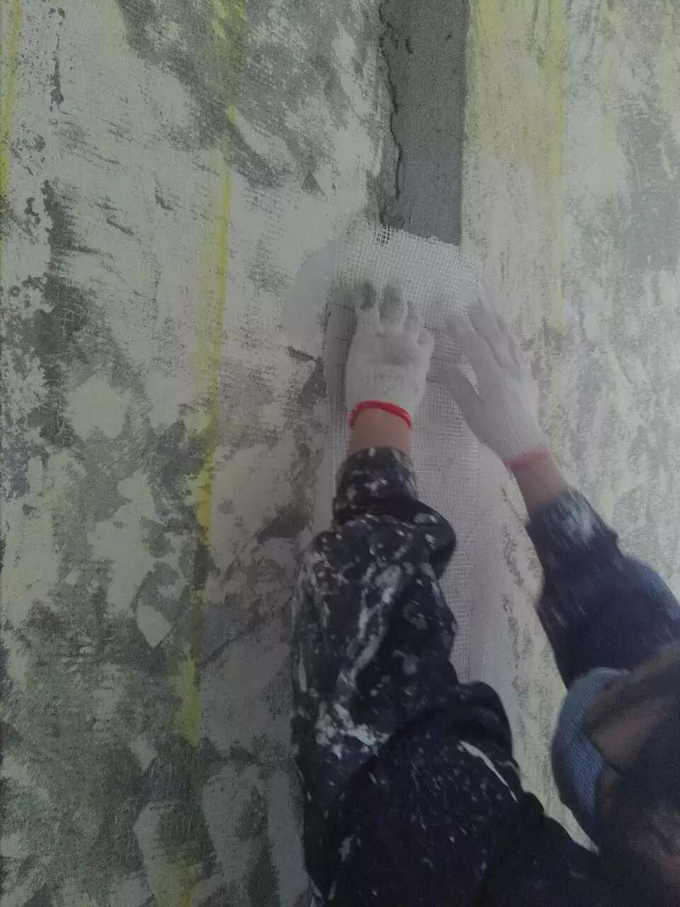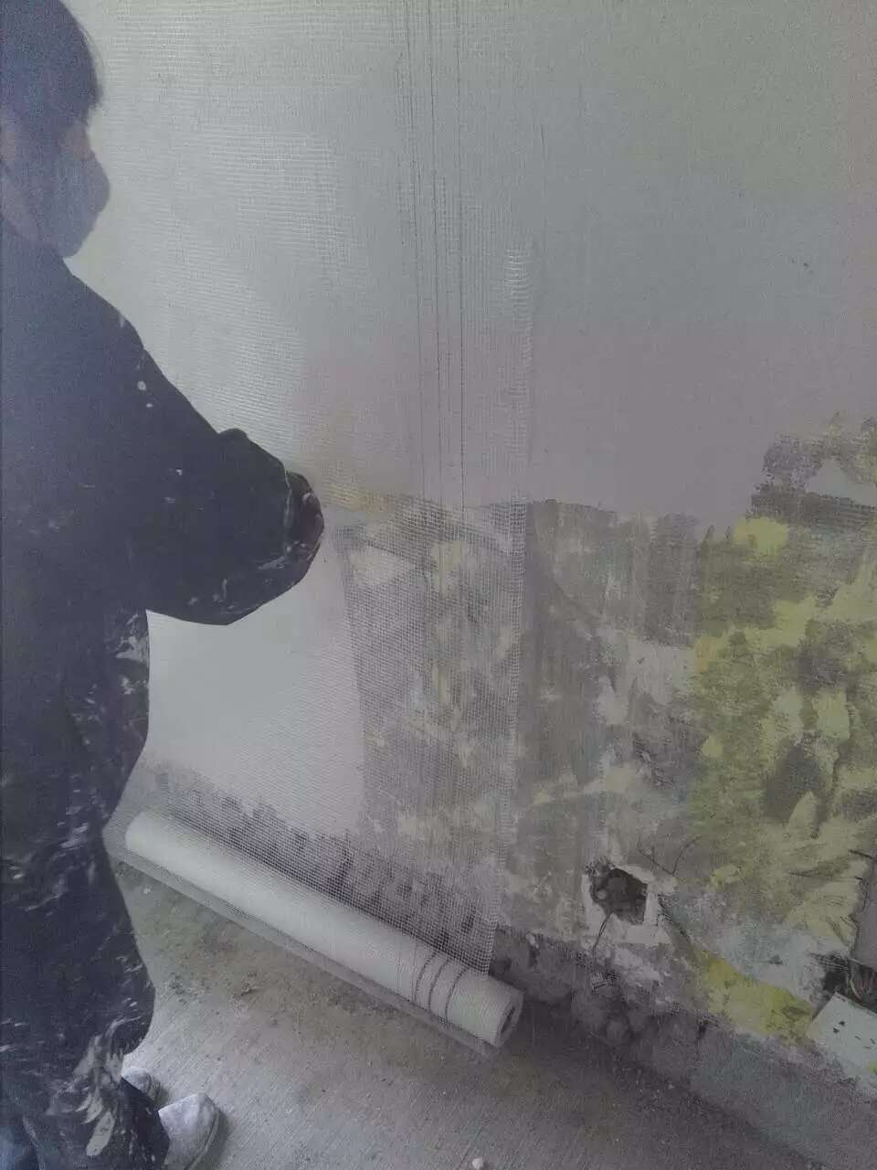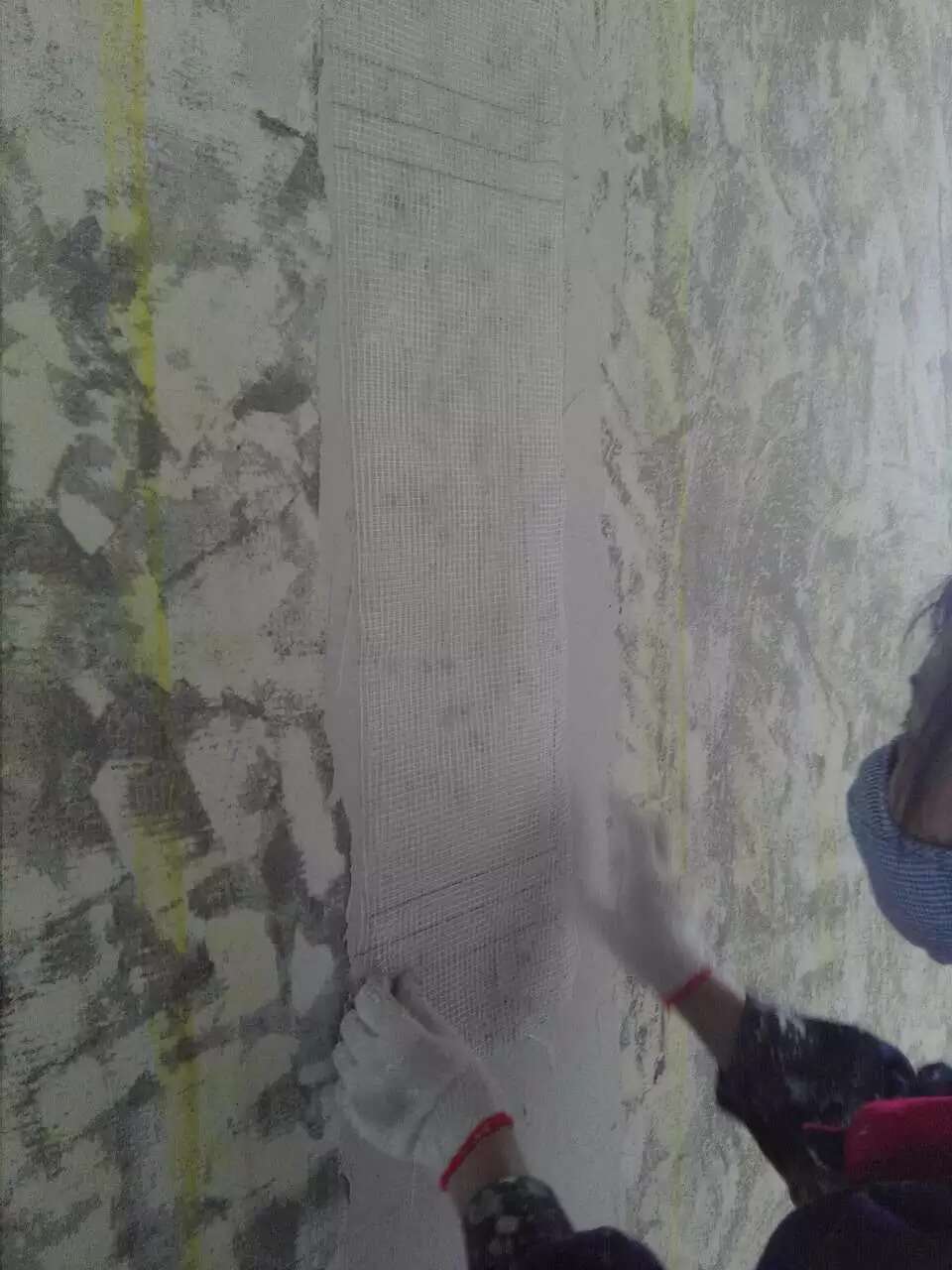 以下一组图片是漆工唐师傅传回的施工照片,新旧墙挂网防裂,线槽贴网。