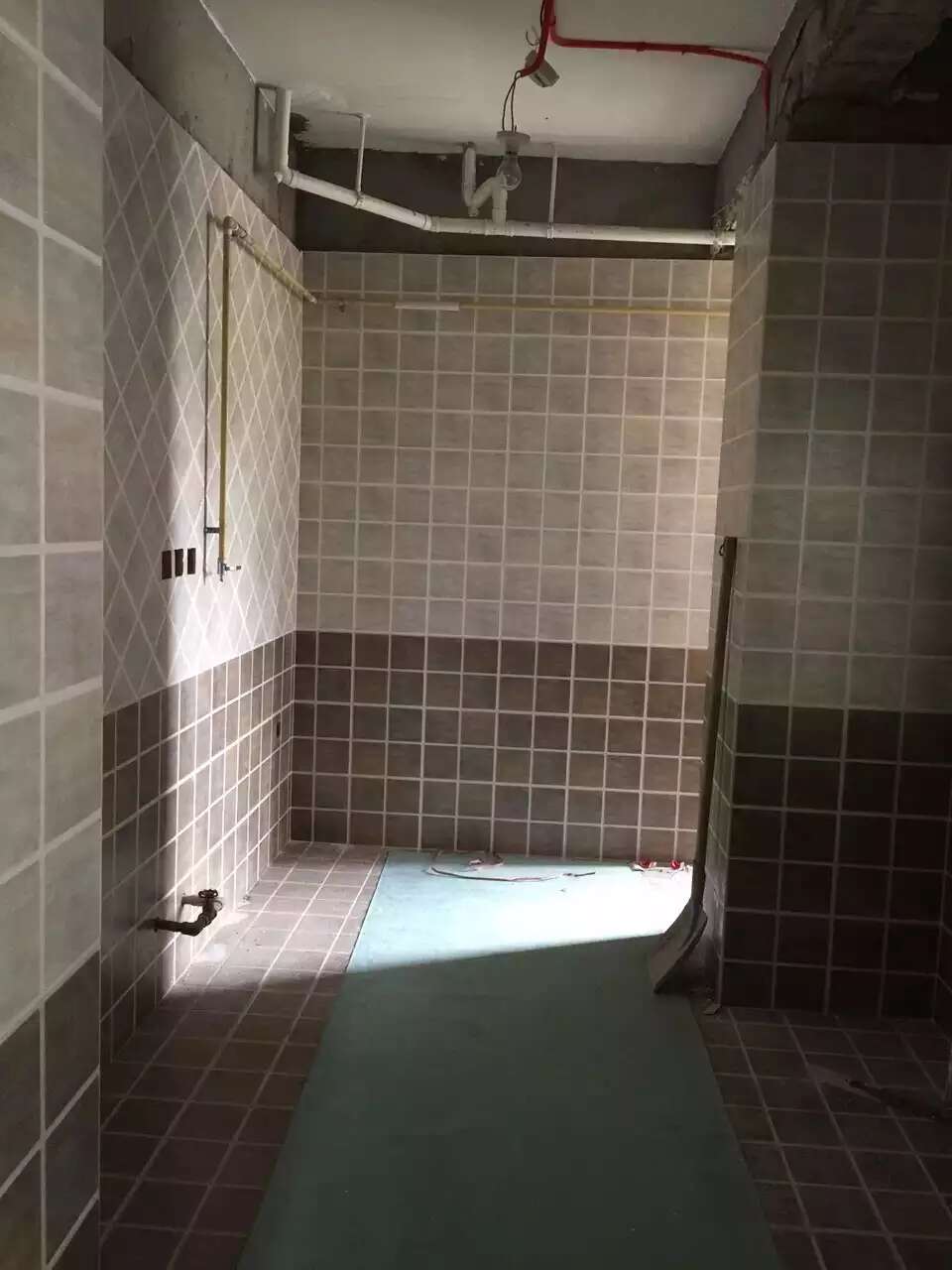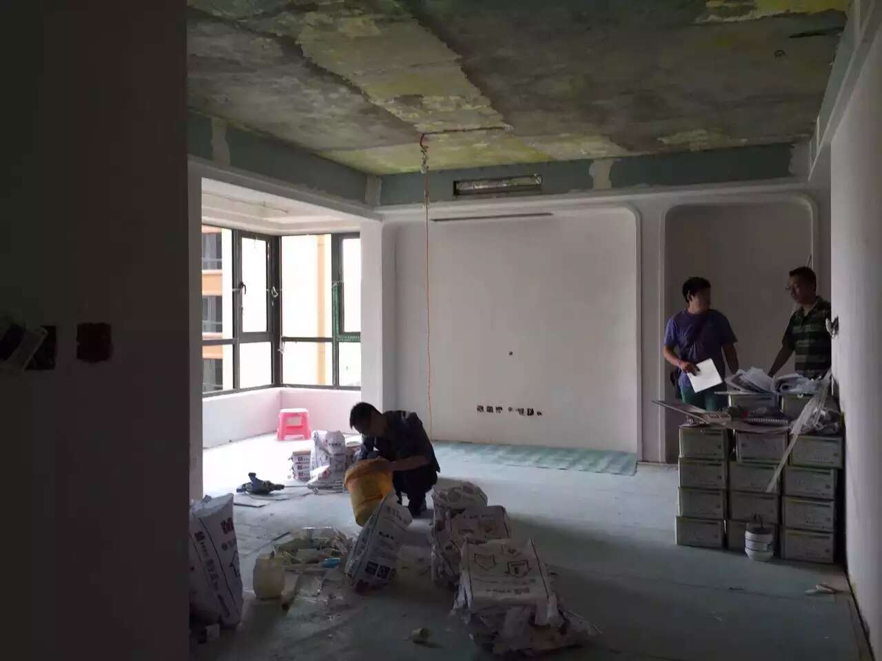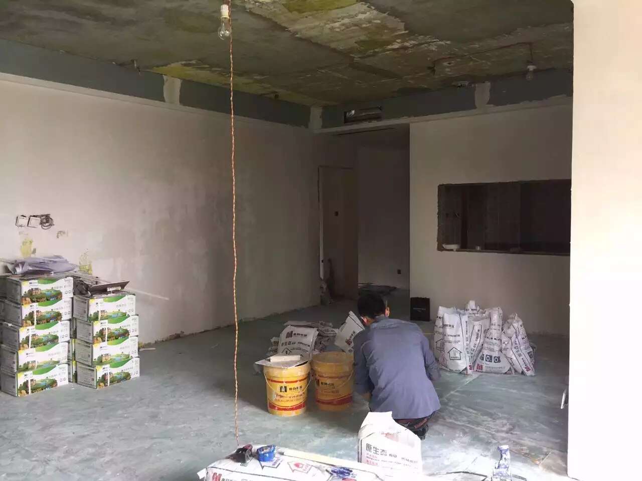 成都华润24城木作,贴砖完成,做好保护后,漆工李师傅刮墙了,原建筑顶面高度误差超过2厘米,华润开发商都不好意思了,来抹平整改。