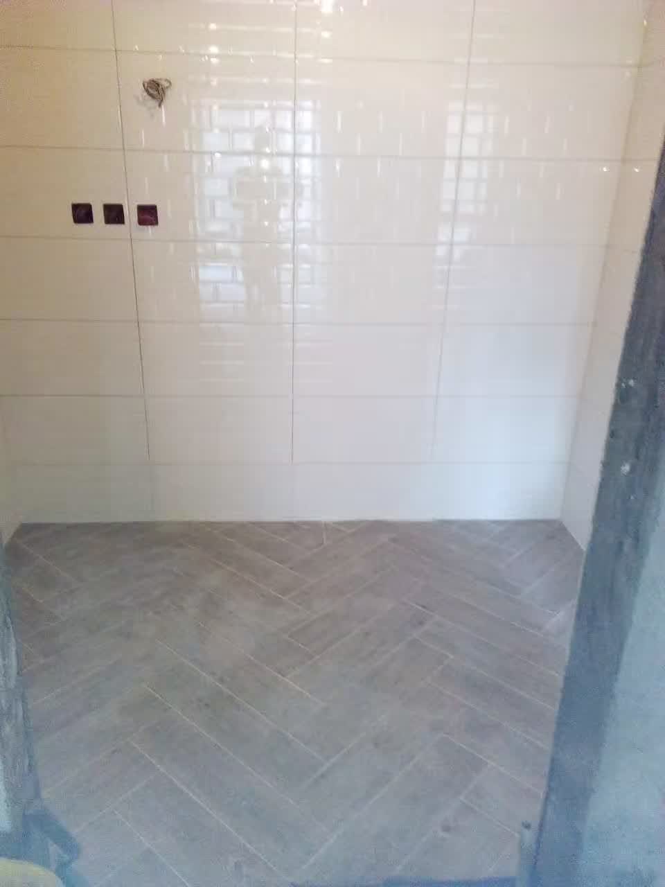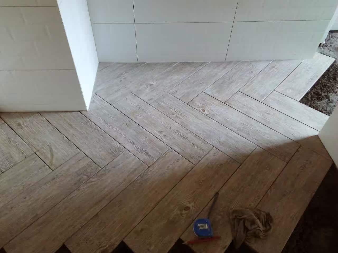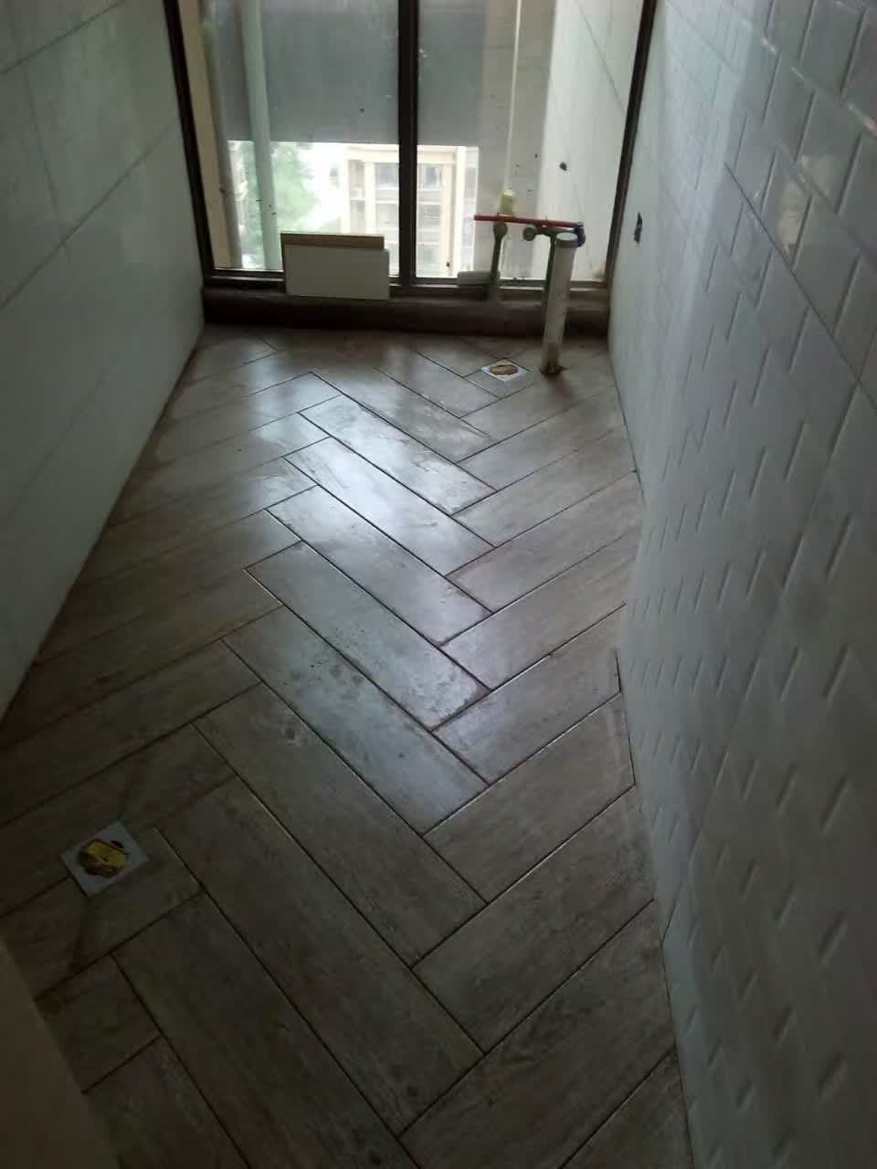 泥工汪国顺师傅,木纹砖人字帖,厨卫砖花纹逼格。汪师傅已铺贴完成做好地面瓷砖保护