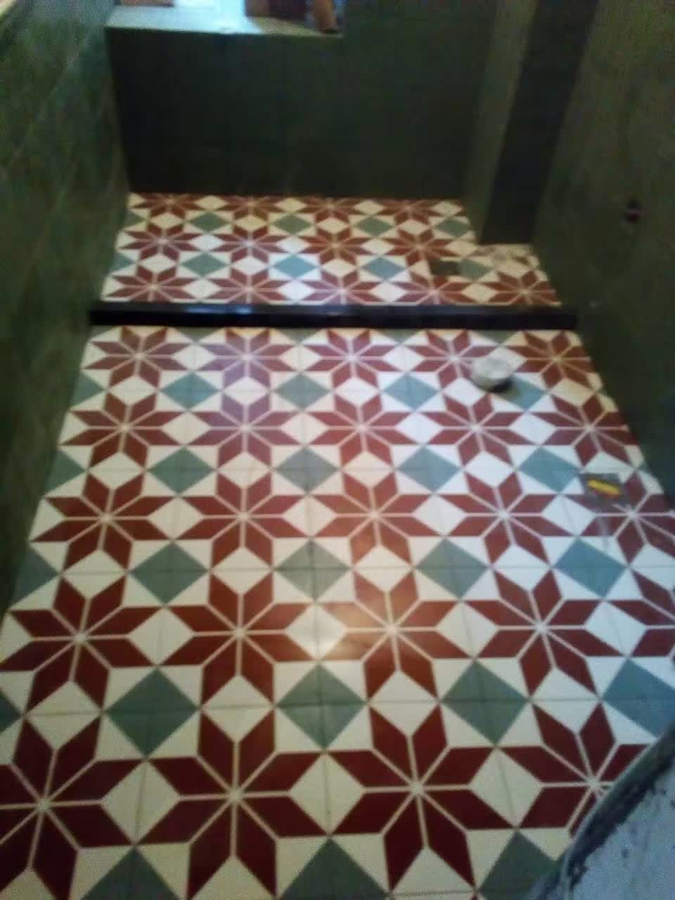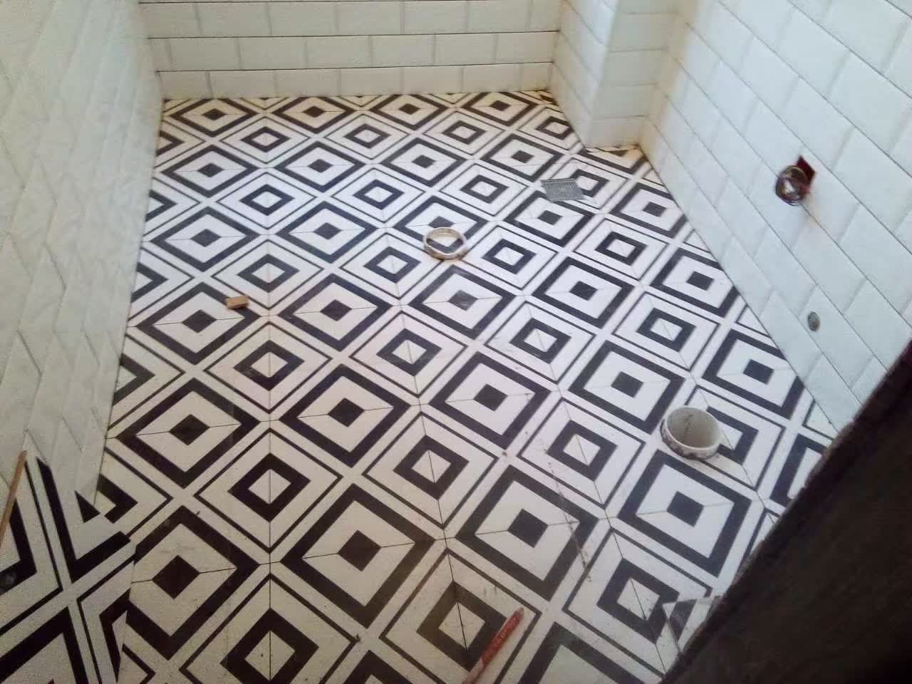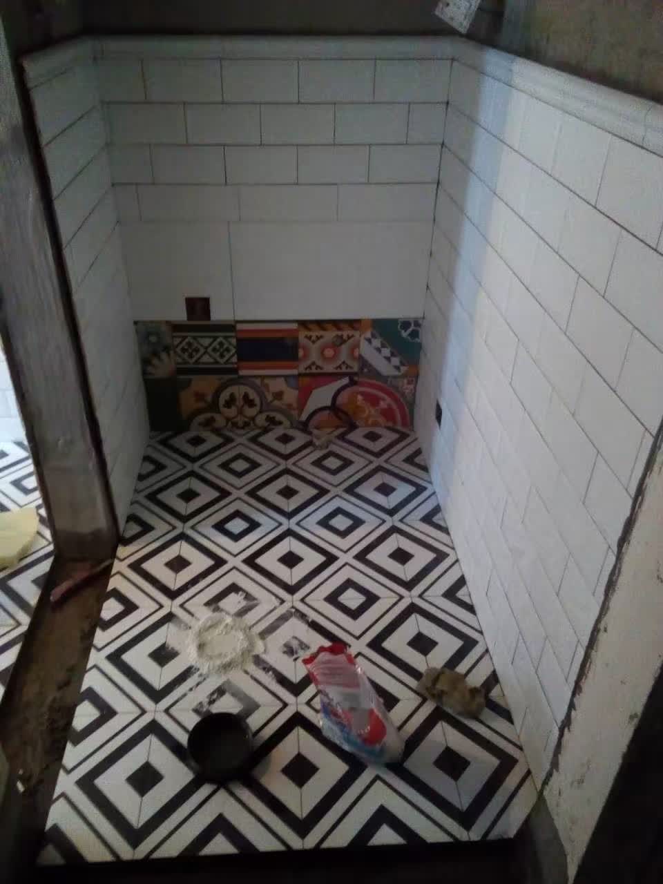 泥工汪国顺师傅,木纹砖人字帖,厨卫砖花纹逼格。汪师傅已铺贴完成做好地面瓷砖保护