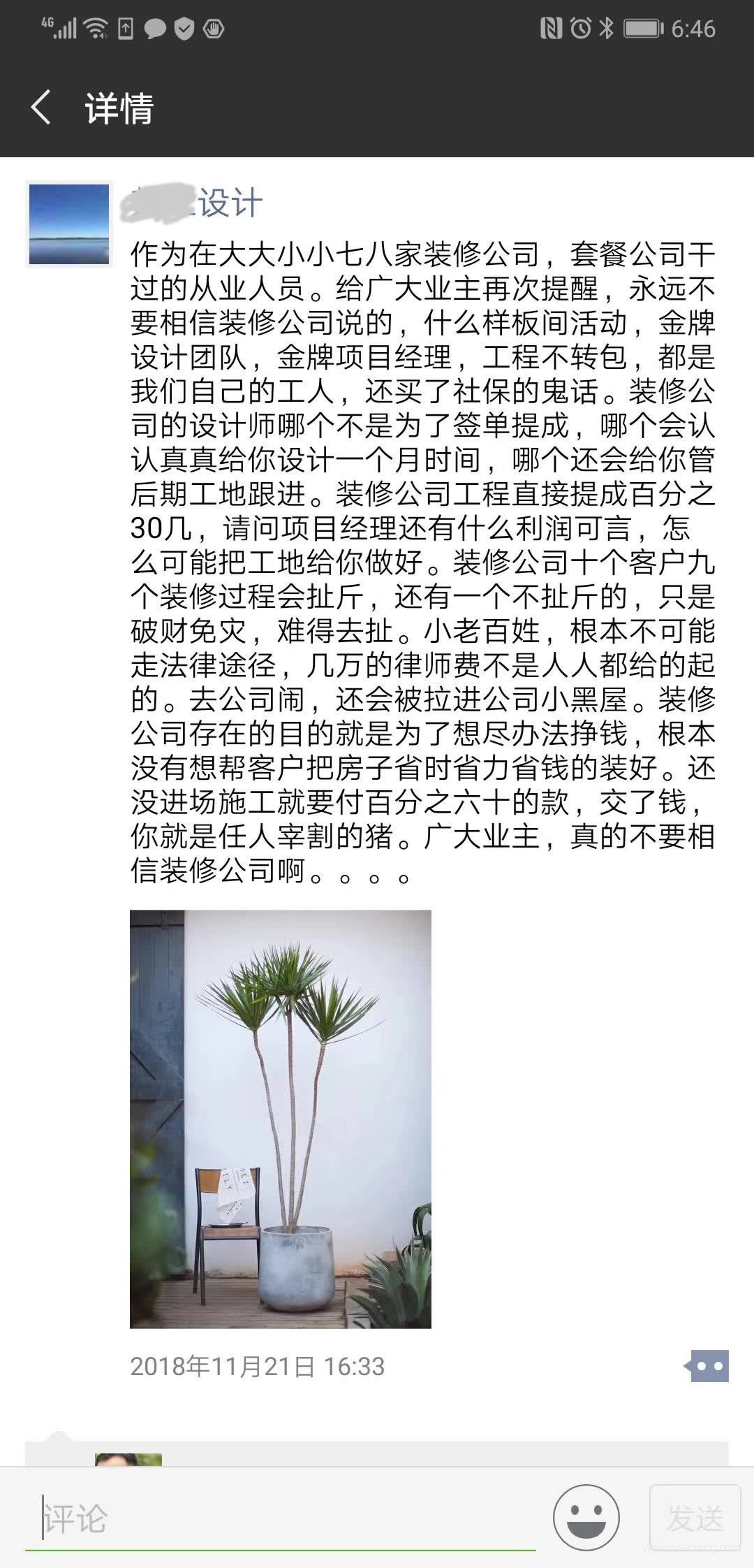 作为在大大小小七八家装修公司,套餐公司干过的从业人员。给广大业主再次提醒,永远不要相信装修公司说的,什么样板间活动,金牌设计团队,金牌项目经理,工程不转包,都是:我们自己的工人,还买了社保的鬼话。装修公司的设计师哪个不是为了签单提成,哪个会认认真真给你设计一个月时间,哪个还会给你管:后期工地跟进。装修公司工程直接提成百分之30几,请问项目经理还有什么利润可言,怎么可能把工地给你做好。装修公司十个客户九个装修过程会扯斤,还有一个不扯斤的,只是:破财免灾,难得去扯。小老百姓,根本不可能走法律途径,几万的律师费不是人人都给的起:的。去公司闹,还会被拉进公司小黑屋。装修公司存在的目的就是为了想尽办法挣钱,根本没有想帮客户把房子省时省力省钱的装好。还没进场施工就要付百分之六十的款,交了钱,你就是任人宰割的猪。广大业主,真的不要相信装修公司啊。。。
