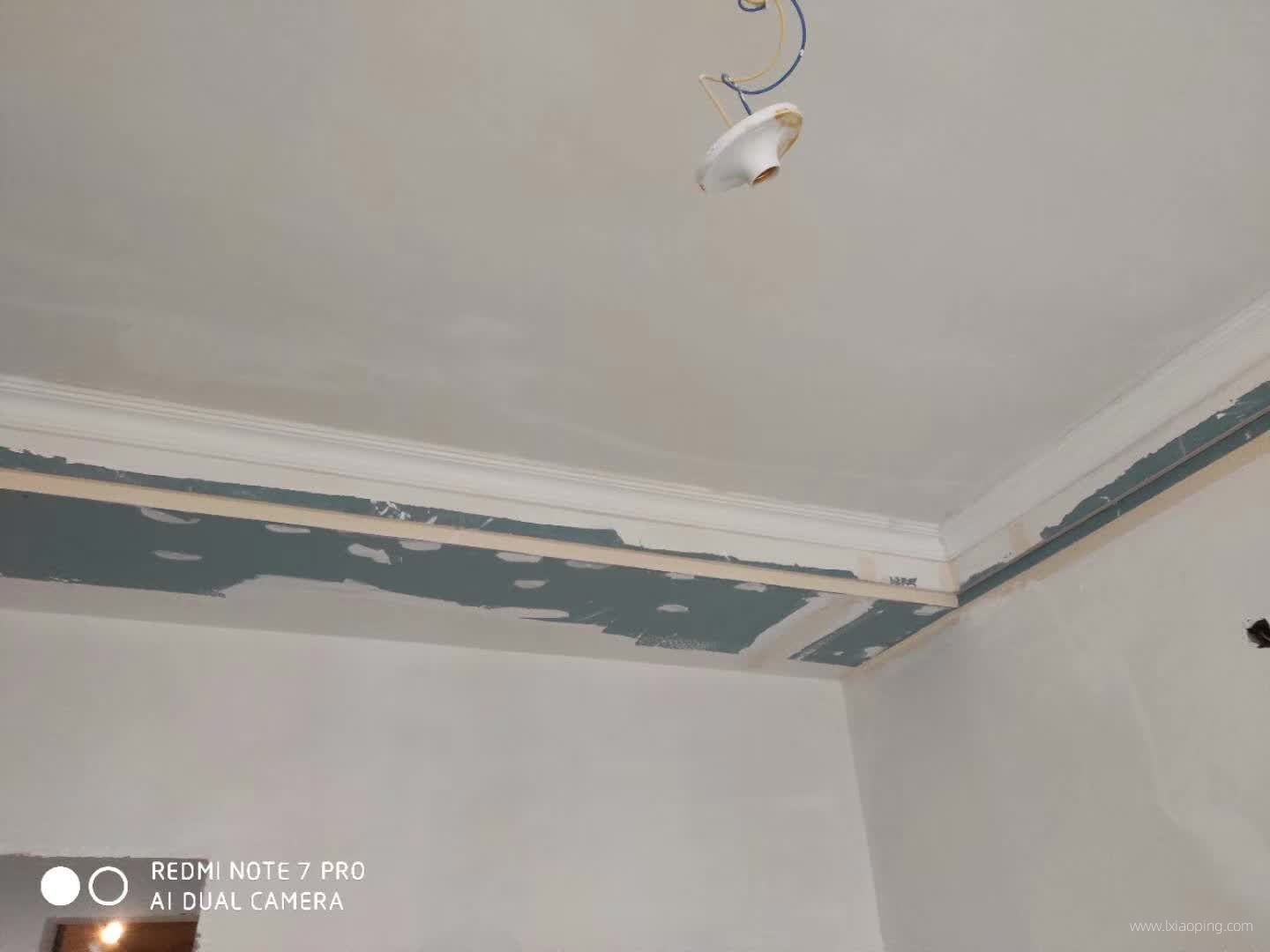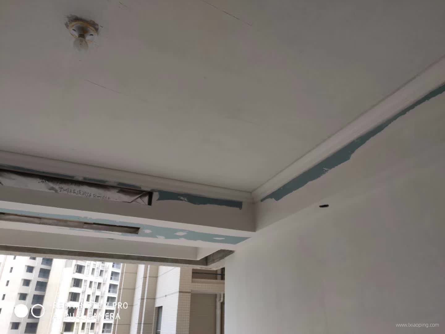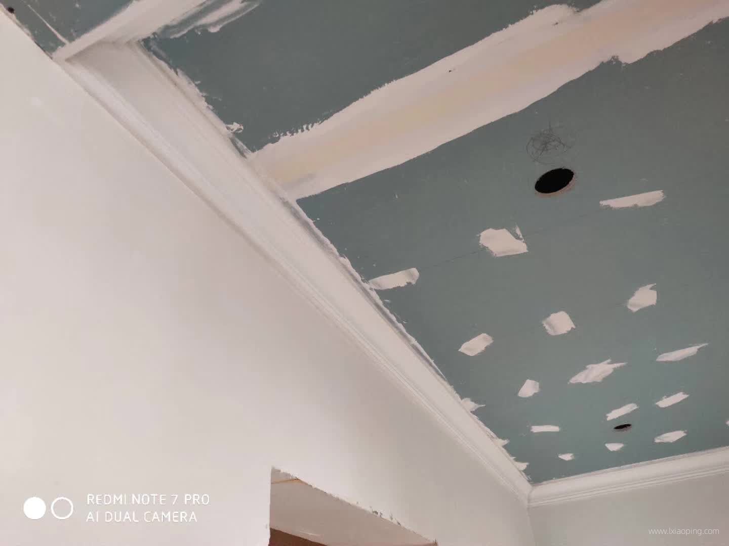 油漆师傅正在对吊顶接缝处和定钉子的地方进行处理。